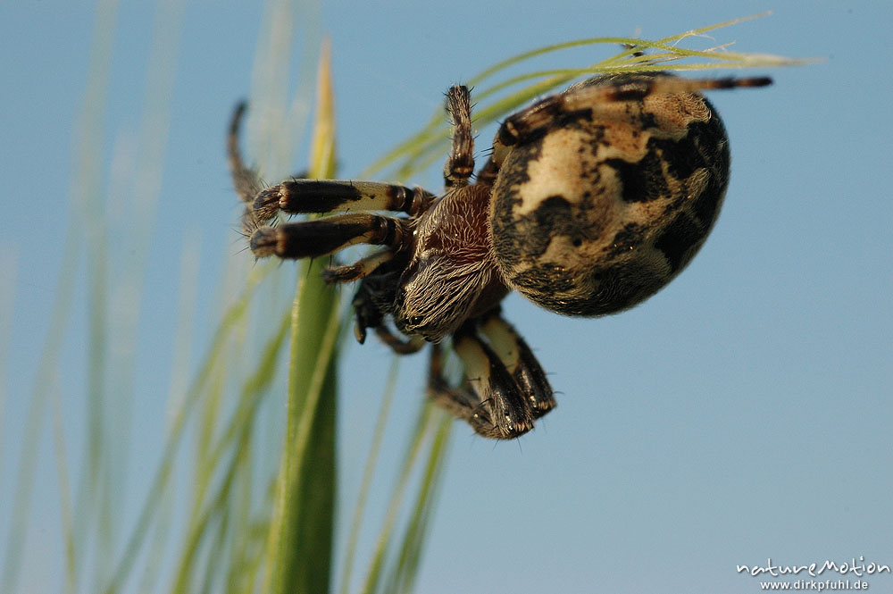 Schilfradspinne, Larinioides cornutus, vielleicht aber auch Araneus patagiatus, an Grashalm neben Gerstenfeld, Gartetal, Göttingen, Deutschland