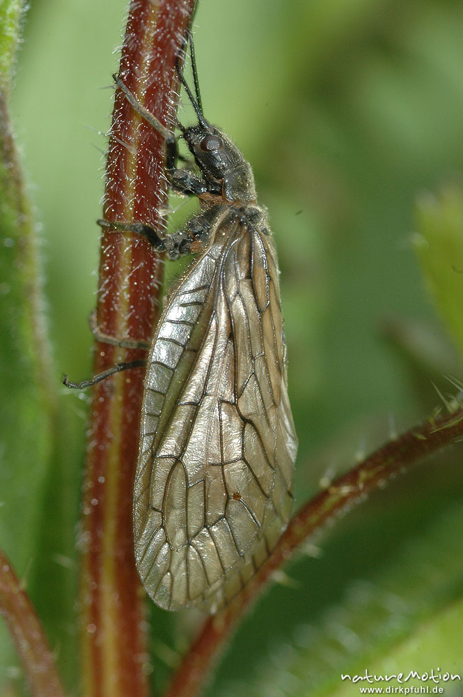 Schlammfliege, Sialis spec., Imago an Pflanzenstengel Seeburger See, Deutschland