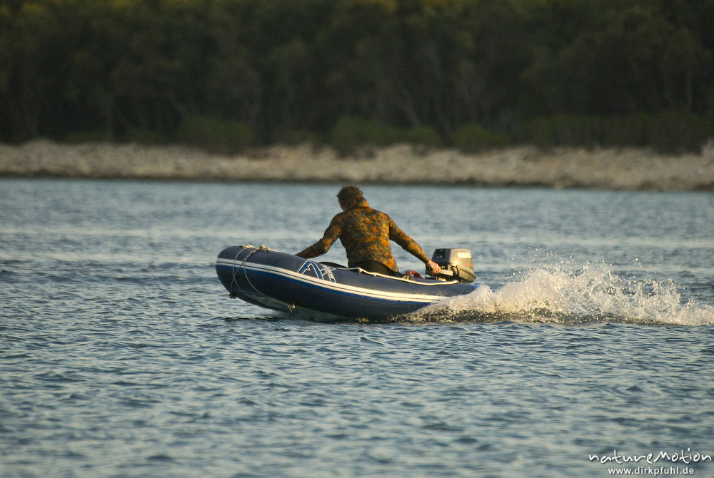 Schlauchboot in voller Fahrt, Bucht Campingplatz Baldarin Cres, Kroatien