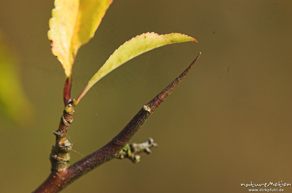 Schlehe, Schwarzdorn, Prunus spinosa, Rosaceae, Dorn, Früchte und Blätter Hoher Hagen, Deutschland