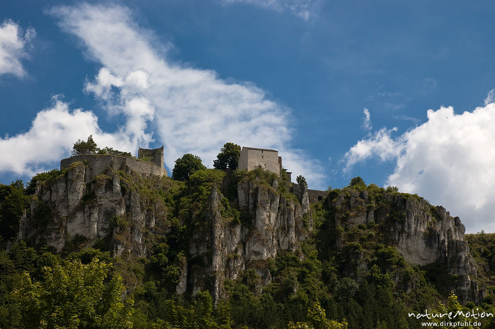 Schloß Pfünz, Blick vom Altmühltal, Burgreste auf steilen Felsen Altmühltal, Deutschland