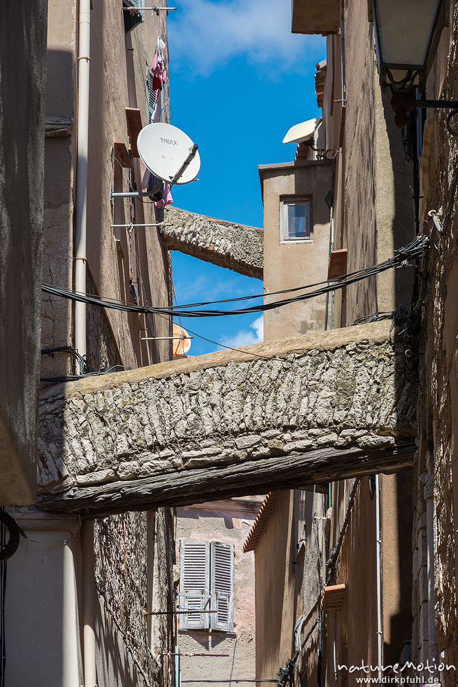 schmale Gassen und Fassaden in der Altstadt von Bonifacio, Korsika, Frankreich