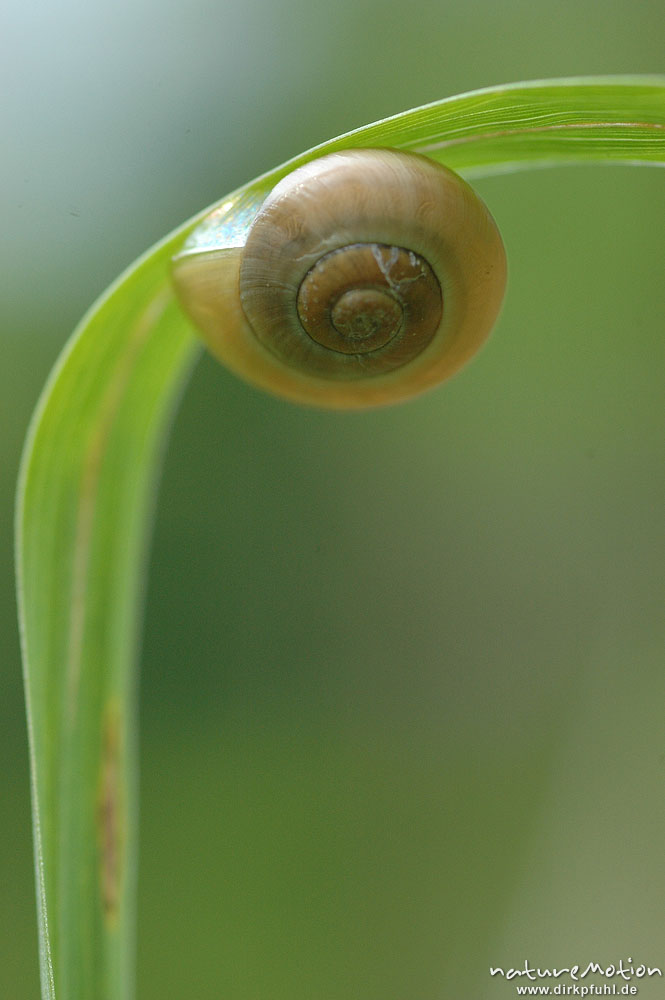 Schneckenhaus an Halmunterseite, geringe Tiefenschärfe, Gartetal Gartetal, Deutschland