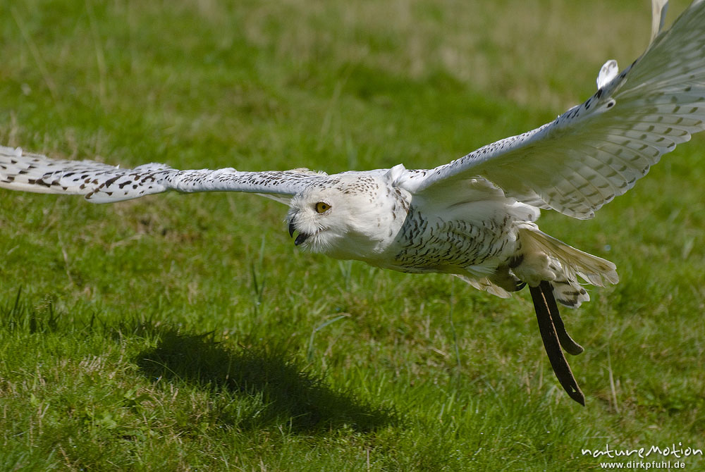 Schnee-Eule, Bubo scandiacus, Nyctea scandiaca, Eigentliche Eulen (Strigidae), im Flug, Falknerei Tierpark Sababurg, captive, Sababurg, Deutschland