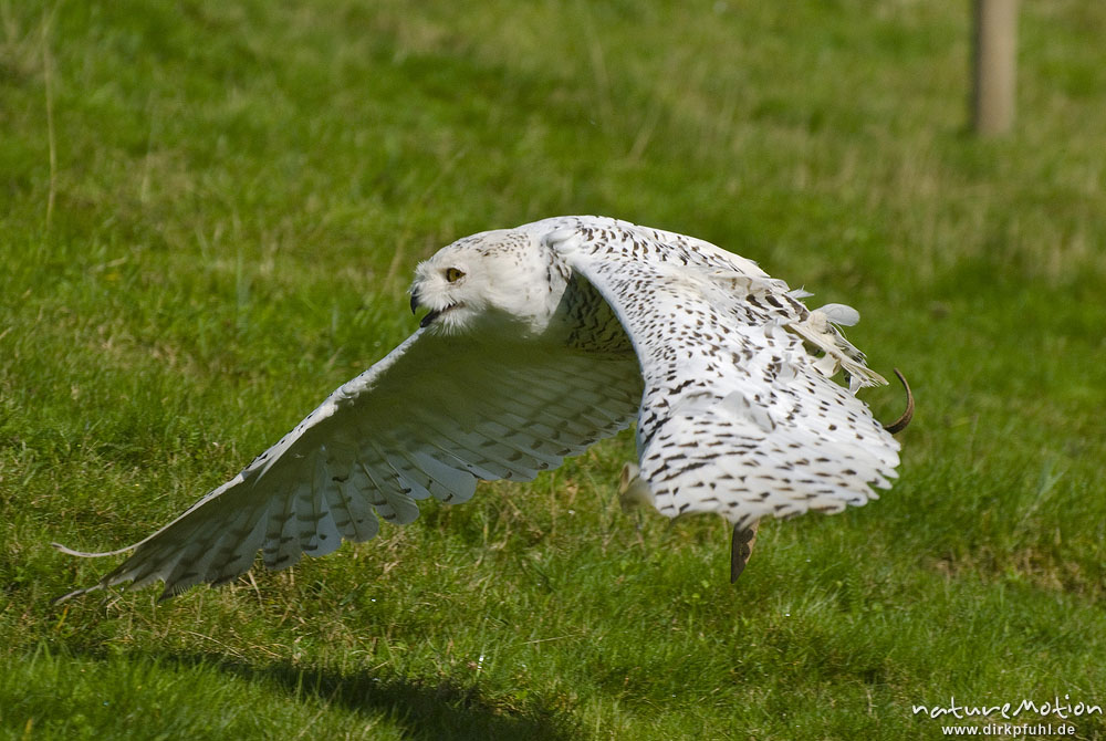 Schnee-Eule, Bubo scandiacus, Nyctea scandiaca, Eigentliche Eulen (Strigidae), im Flug, Falknerei Tierpark Sababurg, captive, Sababurg, Deutschland