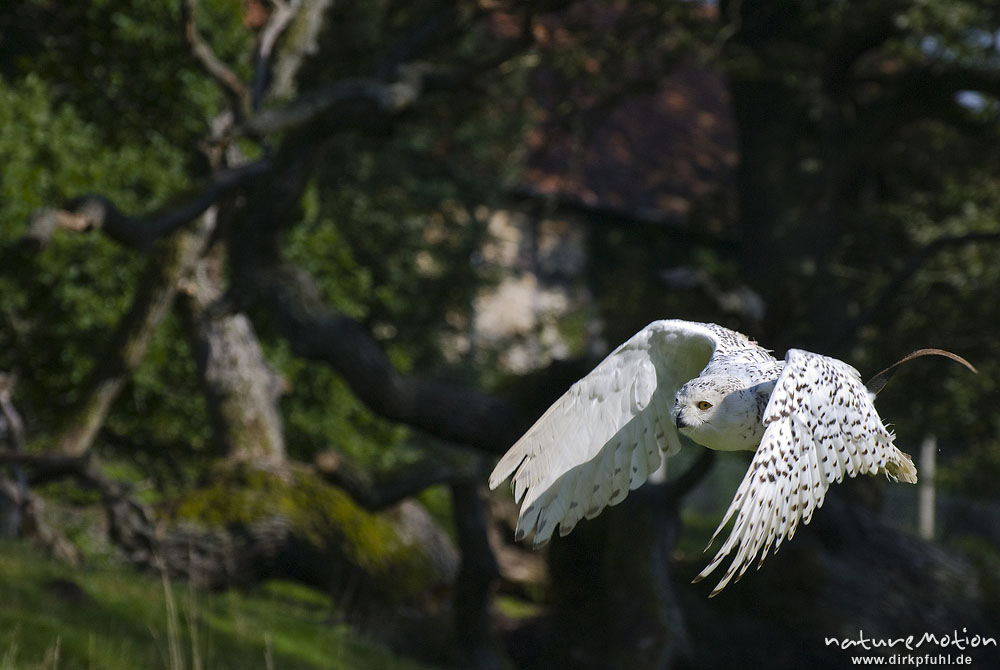 Schnee-Eule, Bubo scandiacus, Nyctea scandiaca, Eigentliche Eulen (Strigidae), im Flug, Falknerei Tierpark Sababurg, captive, Sababurg, Deutschland
