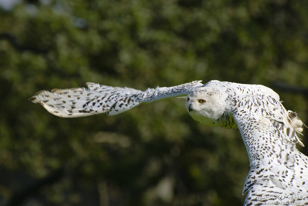 Schnee-Eule, Bubo scandiacus, Nyctea scandiaca, Eigentliche Eulen (Strigidae), im Flug, Falknerei Tierpark Sababurg, captive, Sababurg, Deutschland
