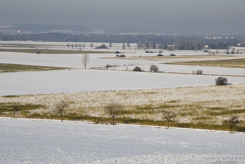 schneebedeckte Felder südlich von Göttingen, Feldwege, Baumreihen Göttingen, Deutschland