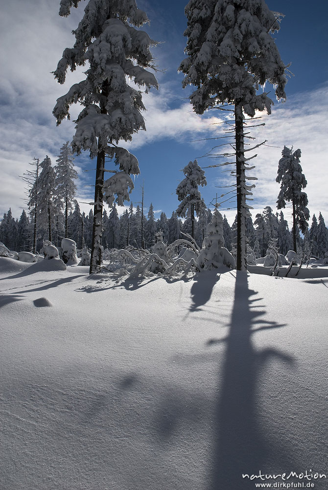 schneebedeckte Fichten im Gegenlicht, Schattenwurf auf Schneedecke, Achtermann Harz, Deutschland