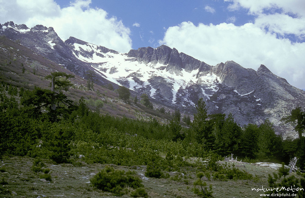 schneebedeckten Bergen, Kiefern, Tavignano-Tal, Korsika, Frankreich