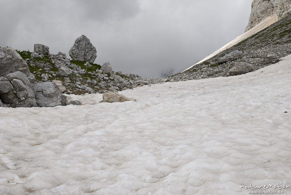 Schneefeld mit Geröll und Felsen, Tal der sieben Seen, Triglav-Nationalpark, Slowenien