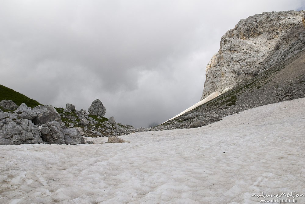 Schneefeld mit Geröll und Felsen, Tal der sieben Seen, Triglav-Nationalpark, Slowenien