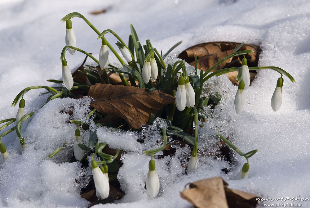 Schneeglöckchen, Galanthus nivalis, Amaryllidaceae, in geschlossener Schneedecke, kleiner Horst mit noch geschlossenen Blüten, Botanischer Garten, Göttingen, Deutschland