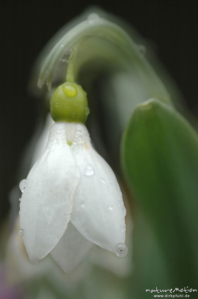 Schneeglöckchen, Galánthus nivális, Blüte mit Wassertropfen, Garten, Kombination aus zwei Fotos mit unterschiedlicher Schärfeebene, Göttingen, Deutschland
