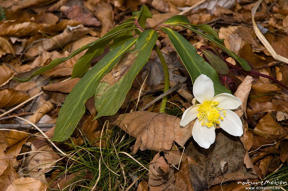 Schneerose, Christrose, Helleborus niger, Hahnenfußgewächse (Ranunculaceae), Blüten und Laubblätter am Waldboden, Königssee, Deutschland