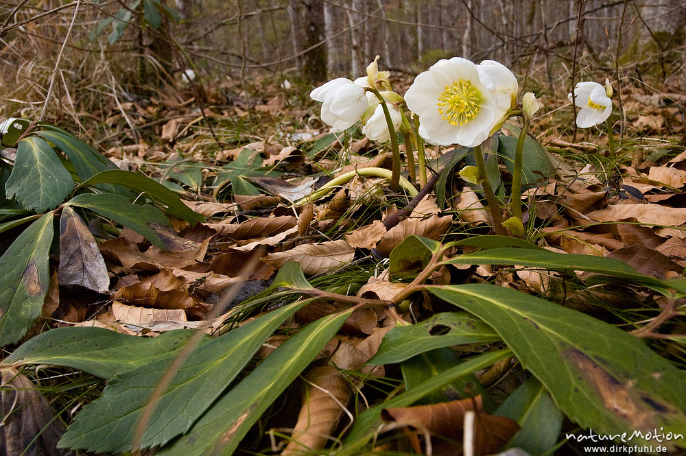 Schneerose, Christrose, Helleborus niger, Hahnenfußgewächse (Ranunculaceae), Blüten und Laubblätter am Waldboden, Königssee, Deutschland