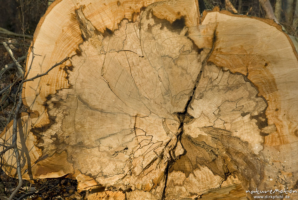 Schnittfläche eines frisch gefällten Baumstamms, Fäulnisbereiche erkennbar?, Pilzbefall?, Göttingen, Deutschland
