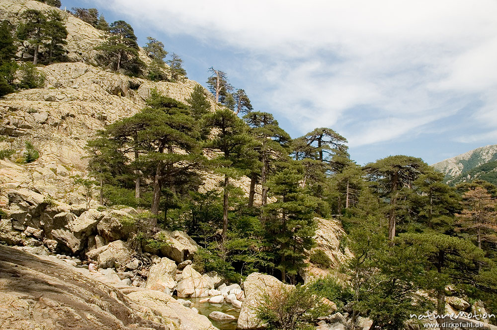 Schwarz-Kiefer, Laricio-Kiefer, Bestand an der Baumgrenze, Cascade des Anglais, Korsika, Frankreich