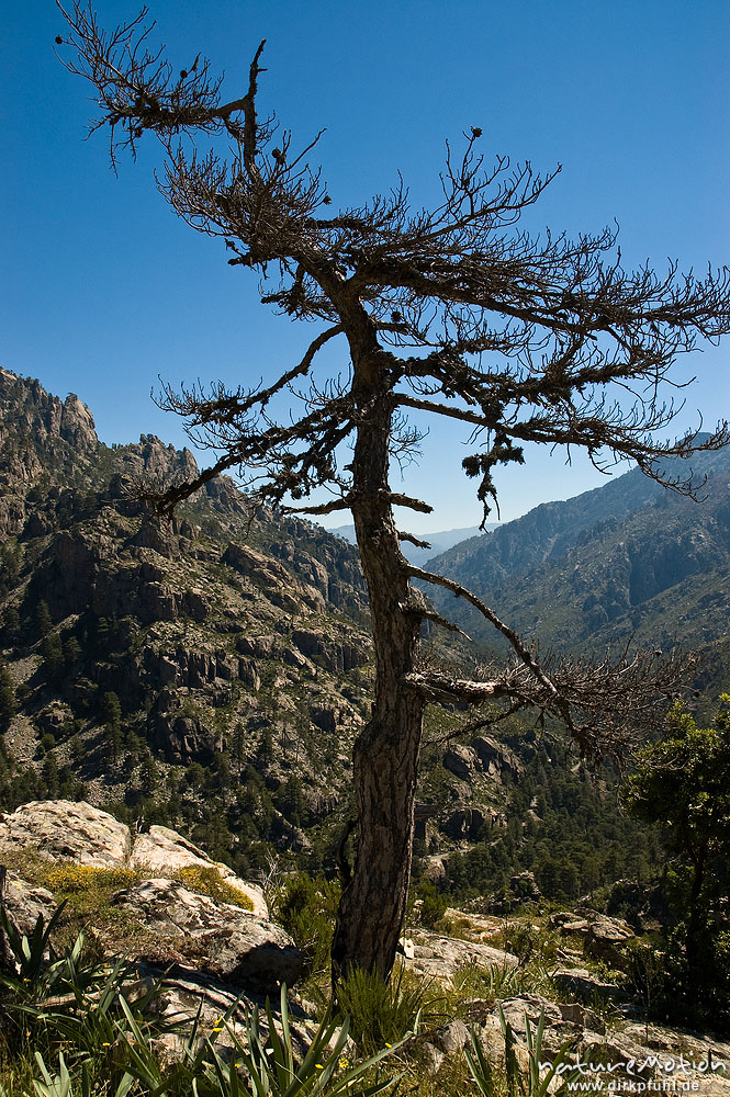 Schwarz-Kiefer, Laricio-Kiefer, Pinus nigra, Pinaceae, abgestorben zwischen Felsen, Restonica-Tal, Korsika, Frankreich