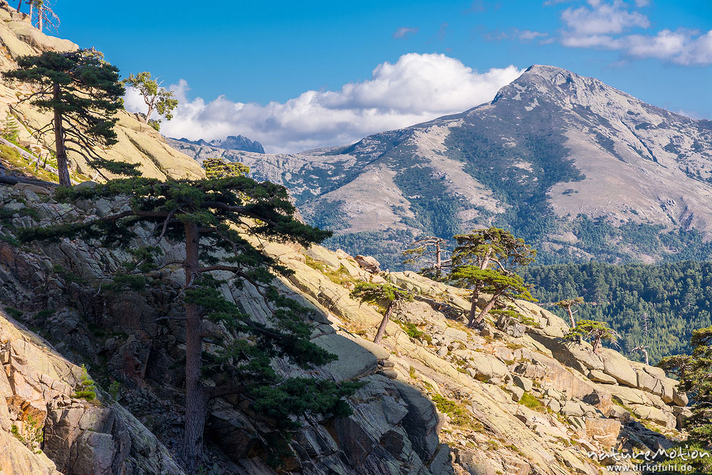 Schwarz-Kiefer, Laricio-Kiefer, Pinus nigra, Pinaceae, Bäume und Wald auf dem Weg durchs Tal des Golo zur Hütte Ciottulo di i Mori, Korsika, Frankreich
