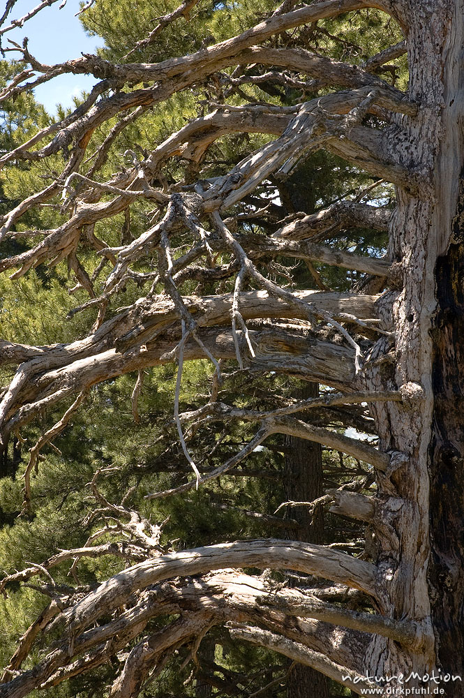 Schwarz-Kiefer, Laricio-Kiefer, Pinus nigra, Pinaceae, Baum mit Brandschäden, abgestorbene Zweige, a, Korsika, Frankreich