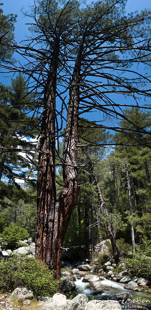 Schwarz-Kiefer, Laricio-Kiefer, Pinus nigra, Pinaceae, Baum mit zweigeteiltem Stamm, Ufer des Manganello-Bach, Korsika, Frankreich