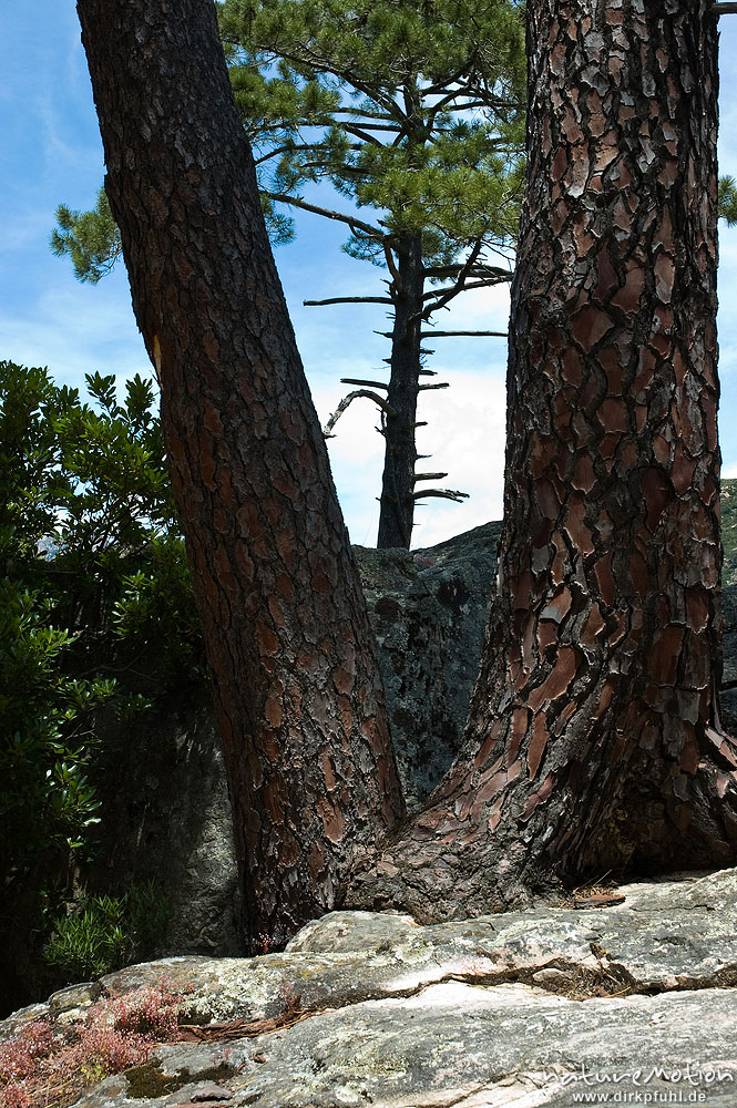 Schwarz-Kiefer, Laricio-Kiefer, Pinus nigra, Pinaceae, Baumstämme und flechtenbedeckte Felsen, Tal d, Korsika, Frankreich