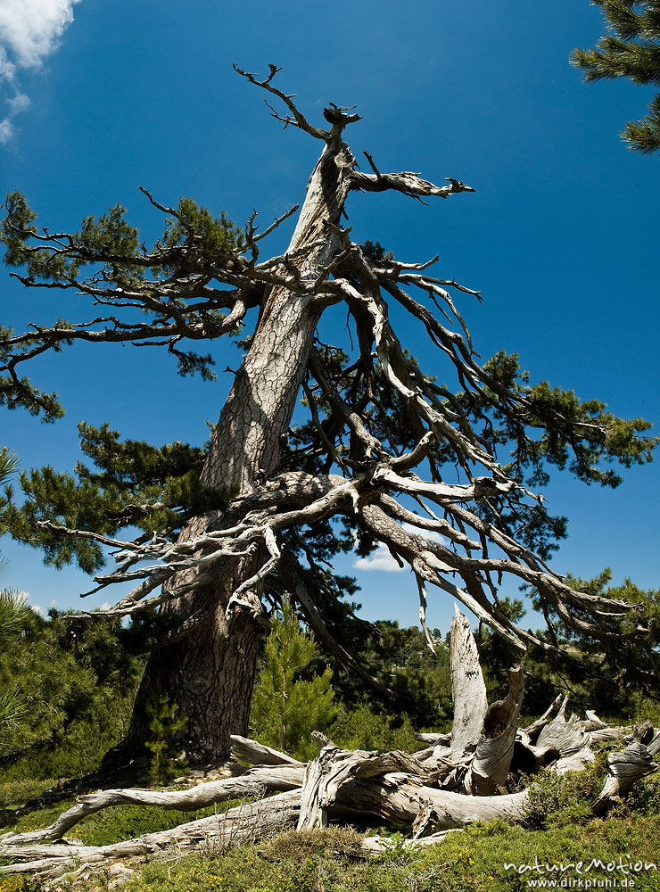 Schwarz-Kiefer, Laricio-Kiefer, Pinus nigra, Pinaceae, sehr alter, einzeln stehender Baum am Rand des Plateau d'Alzo, Korsika, Frankreich