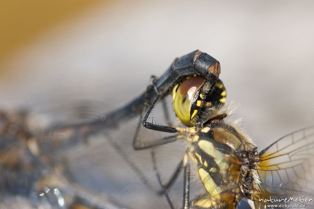 Schwarze Heidelibelle, Sympetrum danae, Libellulidae, Männchen Weibchen, Paarungsrad auf Holzbohle, Detailansicht Haltegriff der männlichen Abdominalanhänge am weiblichen Hinterkopf, Mecklenbruch im Solling, Deutschland