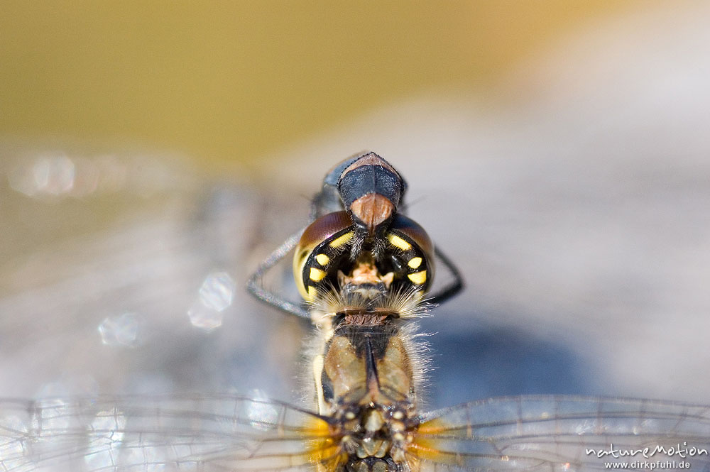 Schwarze Heidelibelle, Sympetrum danae, Libellulidae, Männchen Weibchen, Paarungsrad auf Holzbohle, Detailansicht Haltegriff der männlichen Abdominalanhänge am weiblichen Hinterkopf, Mecklenbruch im Solling, Deutschland