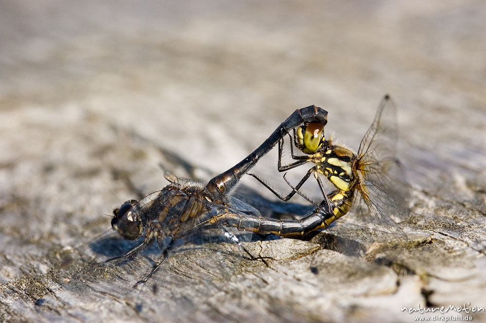 Schwarze Heidelibelle, Sympetrum danae, Libellulidae, Männchen Weibchen, Paarungsrad auf Holzbohle, Mecklenbruch im Solling, Deutschland