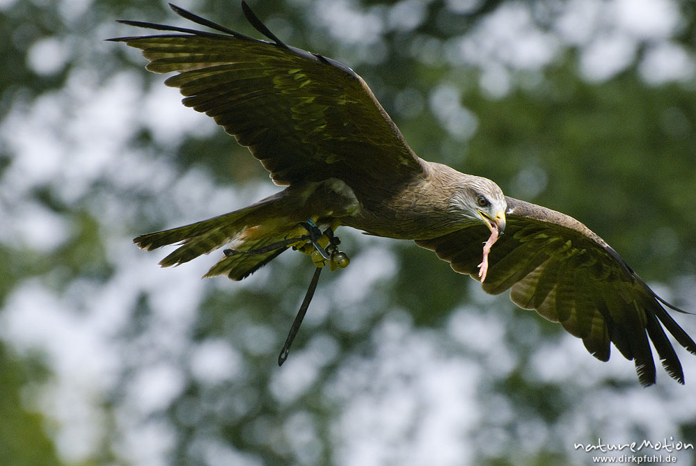 Schwarzmilan, Schwarzer Milan, Milvus migrans, Habichtartige (Accipitridae), im Flug mit Futter im Schnabel, Falknerei Tierpark Sababurg, captive, Sababurg, Deutschland