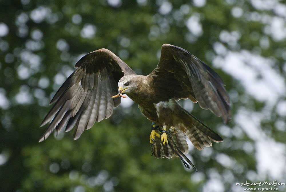 Schwarzmilan, Schwarzer Milan, Milvus migrans, Habichtartige (Accipitridae), im Flug mit Futter im Schnabel, Falknerei Tierpark Sababurg, captive, Sababurg, Deutschland