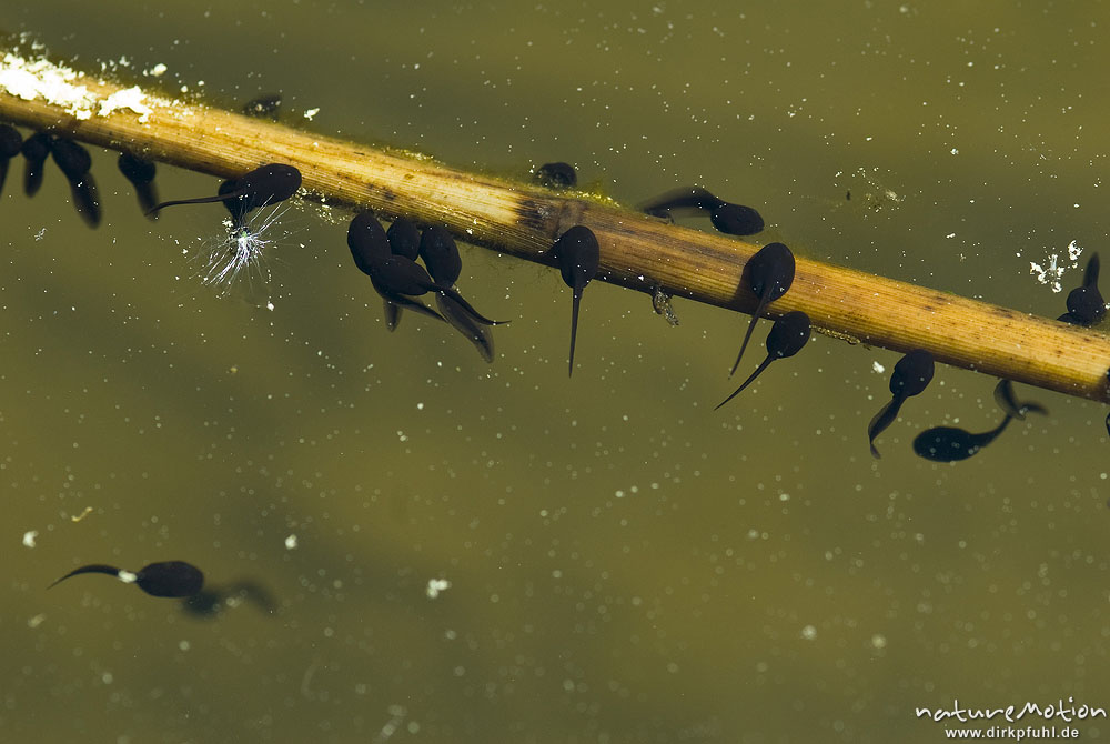 Seefrosch, Rana ridibunda, Ranidae, Kaulquappen an einem Pflanzenhalm, Fischteich im Silberbachtal bei Schloßborn, A nature document - not arranged nor manipulated, Königstein im Taunus, Deutschland