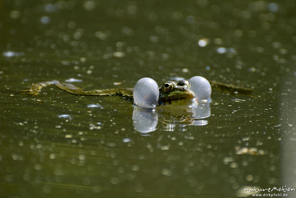 Seefrosch, Rana ridibunda, Ranidae, Männchen, rufend, mit aufgeblasenen Schallblasen, Fischteich im Silberbachtal bei Schloßborn, A nature document - not arranged nor manipulated, Königstein im Taunus, Deutschland