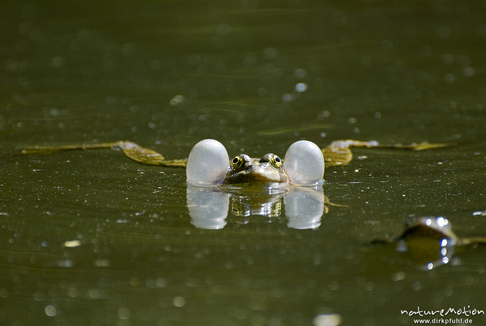Seefrosch, Rana ridibunda, Ranidae, Männchen, rufend, mit aufgeblasenen Schallblasen, Fischteich im Silberbachtal bei Schloßborn, A nature document - not arranged nor manipulated, Königstein im Taunus, Deutschland