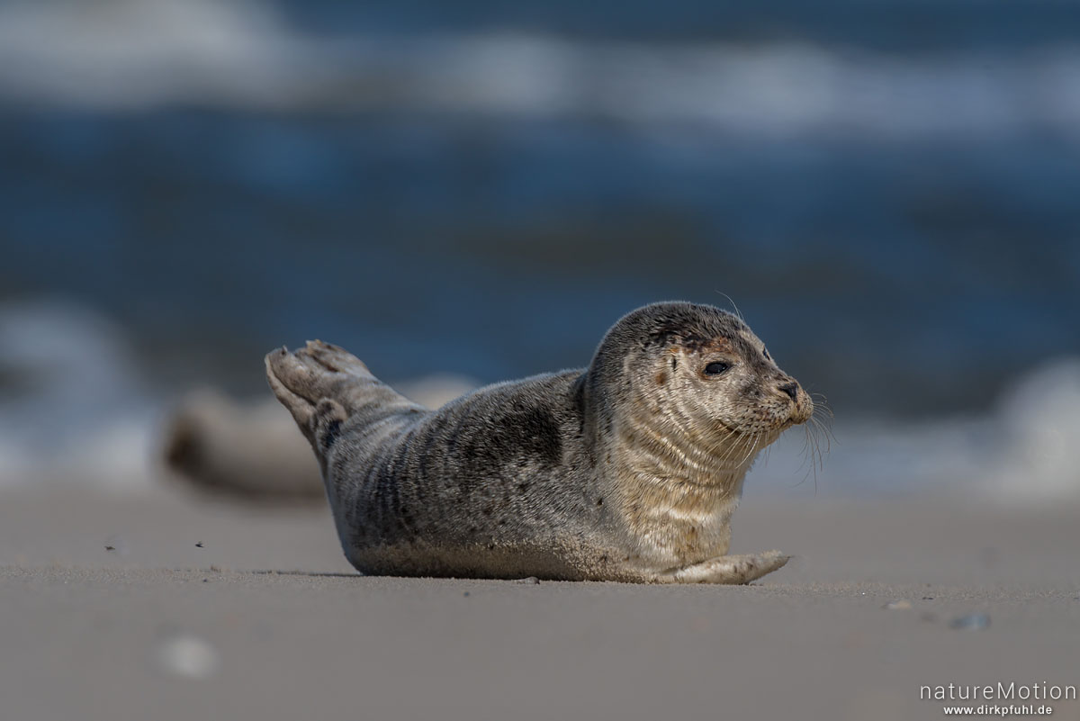 Seehund, Phoca vitulina, Phocidae, Tier sonnt sich auf dem Strand nahe Spülsaum, Spiekeroog, Deutschland