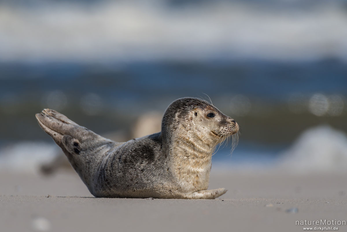 Seehund, Phoca vitulina, Phocidae, Tier sonnt sich auf dem Strand nahe Spülsaum, Spiekeroog, Deutschland