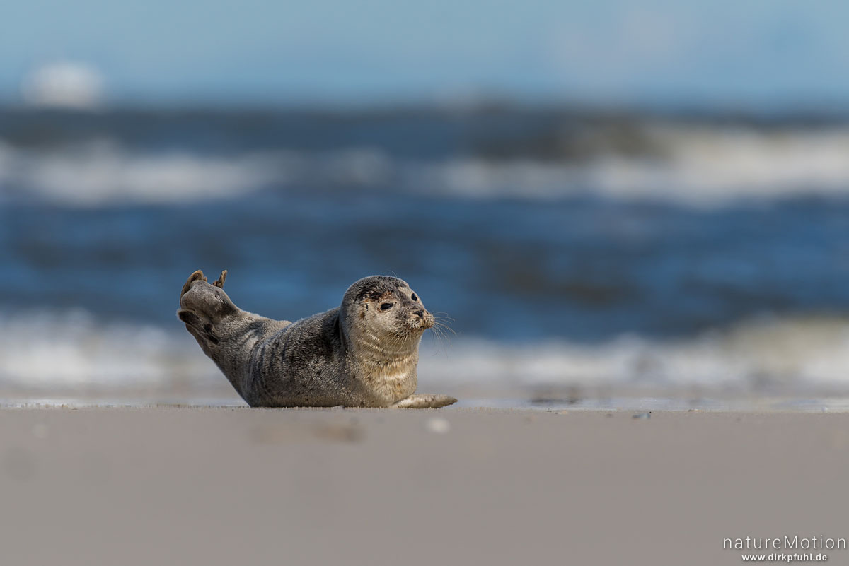 Seehund, Phoca vitulina, Phocidae, Tier sonnt sich auf dem Strand nahe Spülsaum, Spiekeroog, Deutschland