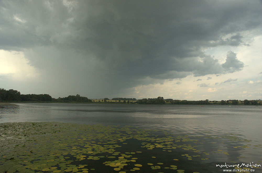Seerosenblätter und abziehender Regenschauer Seeburger See, Deutschland