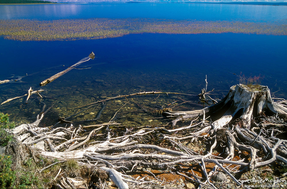 Seeufer mit ausgeblichenen Baumst?mpfen und im Hintergrund Wasser-Kn?terich Chowsg?l Nuur, Mongolei