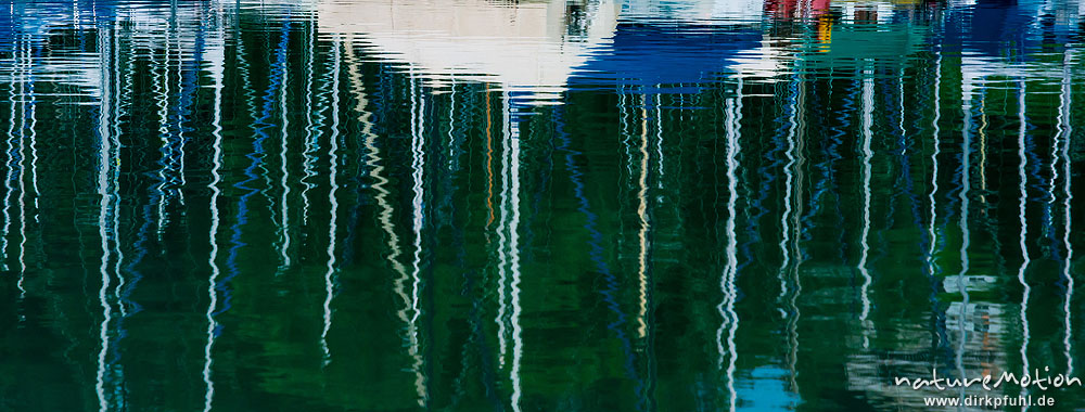 Segelboote am Steg, Spiegelung der Masten im gekräuselten Wasser, Füssen, Deutschland