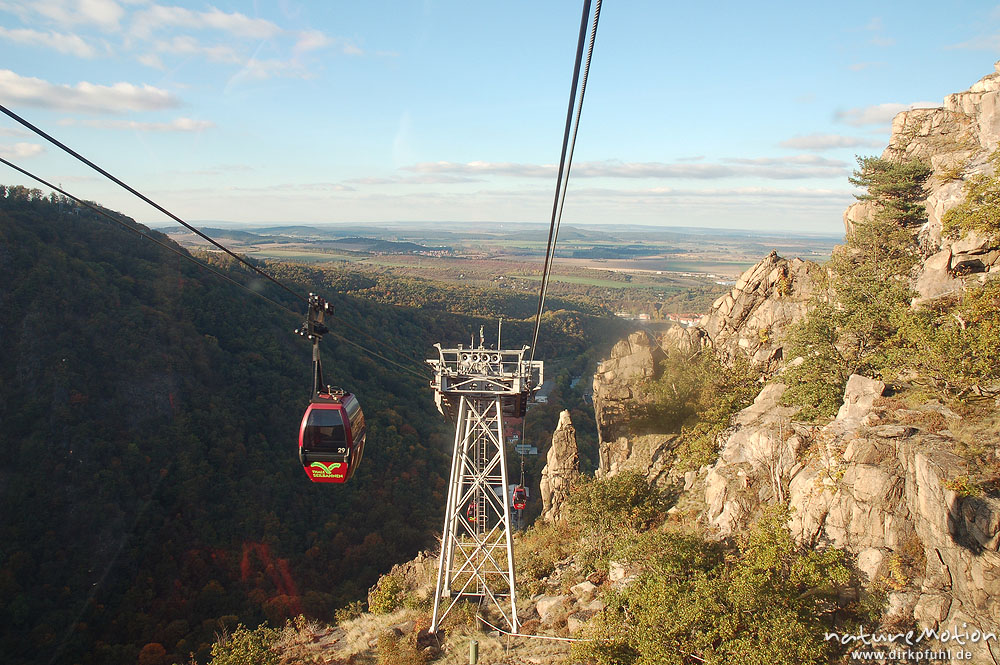 Seilbahn, Talfahrt vom Hexentanzplatz nach Thale, Blick übers Harzvorland, Bodetal Bodetal, Deutschland