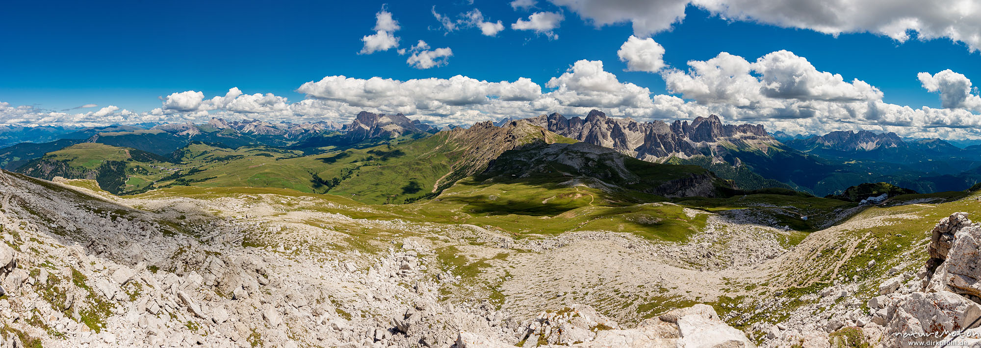 Seiseralm, Geissler Gruppe, Langkofel, Plattkofel, Blick vom Gipfel des Petz, Seiseralm (Südtirol), Italien