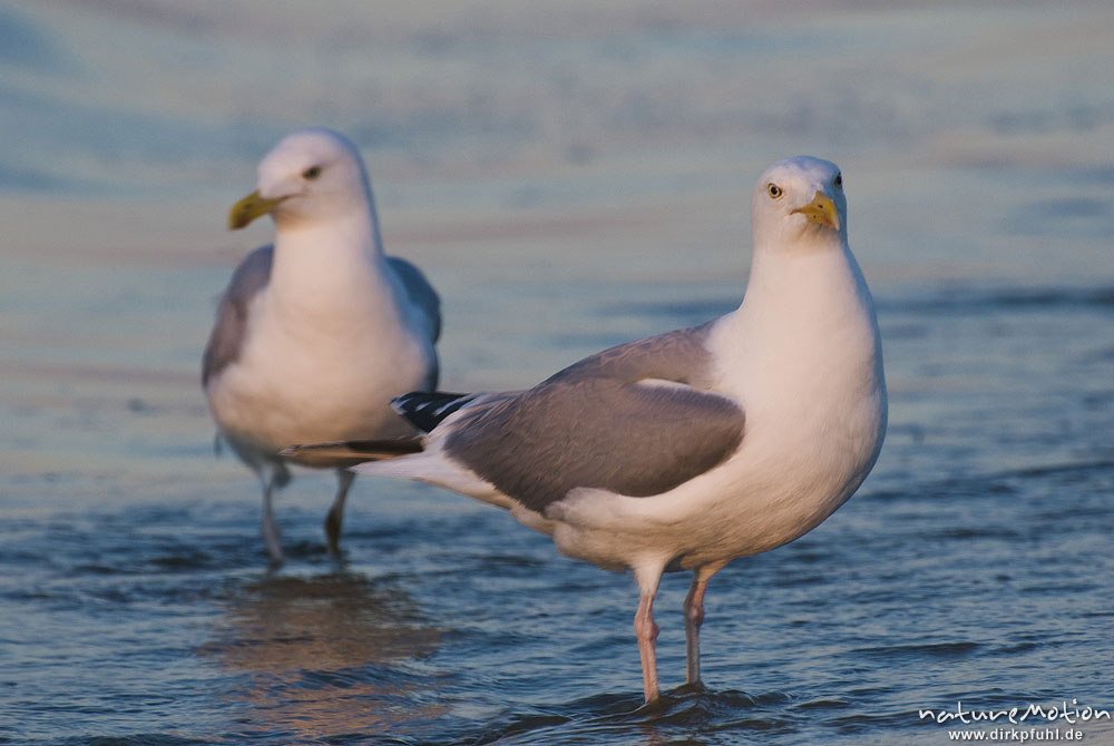 Silbermöwe, Larus Argentatus, Laridae, mehrere Tiere im Wasser direkt am Strand, Fütterung durch Touristen, Strand von Prerow, wild and controlled, Darß, Zingst, Deutschland