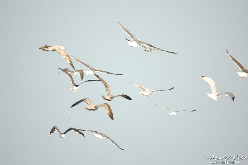 Silbermöwe, Larus Argentatus, Laridae, Schwarm, juvenil, im Flug, Amrum Amrum, Deutschland