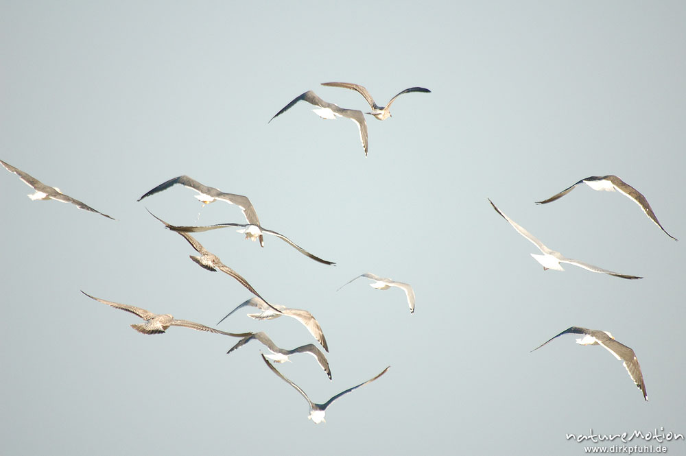 Silbermöwe, Larus Argentatus, Laridae, Schwarm, juvenil, im Flug, Amrum Amrum, Deutschland