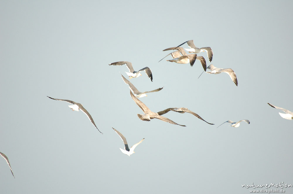 Silbermöwe, Larus Argentatus, Laridae, Schwarm, juvenil, im Flug, Amrum Amrum, Deutschland