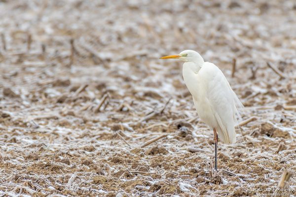 Silberreiher, Casmerodius albus, Reiher (Ardeidae), Tier sitzt auf Ast, Schneefall, Kiessee, Göttingen, Deutschland