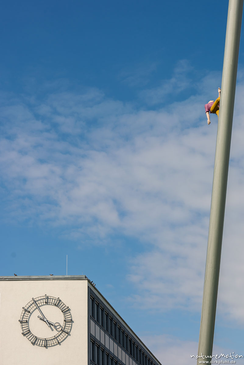 Skulptur "Man walking to the sky" von Jonathan Borofsky am Hauptbahnhof Kassel, Bahnhofsuhr, blauer Himmel, Kassel, Deutschland